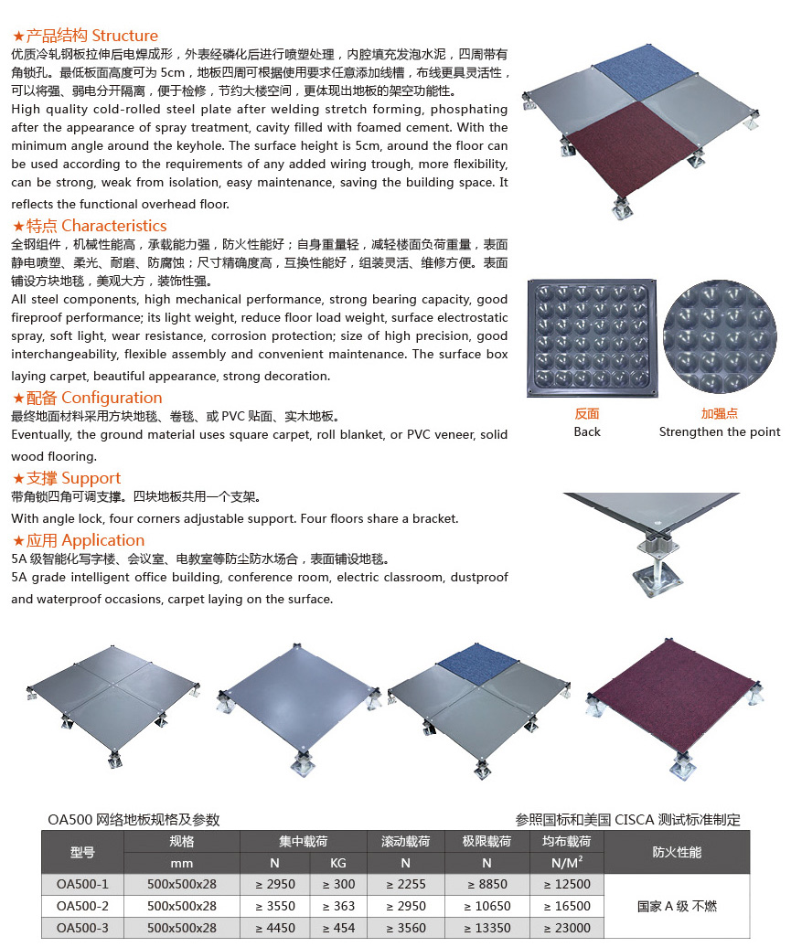 OA500全鋼網(wǎng)絡(luò )地板是一種新型地面覆蓋材料,由高強度鋼板和連接件組成。它具有輕便、堅固、耐腐蝕等特點(diǎn),在各種場(chǎng)所得到廣泛應用。